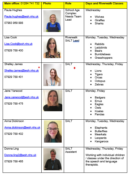 Please find below a list of the classes at Riverwalk and the name of the physiotherapist covering each class. Although each class has a named therapist, the physiotherapy team work closely together and may work jointly with some children or support each other to cover classes depending on capacity and availability. For new referrals to Physiotherapy in classes not currently allocated, we will contact you to discuss your named therapist